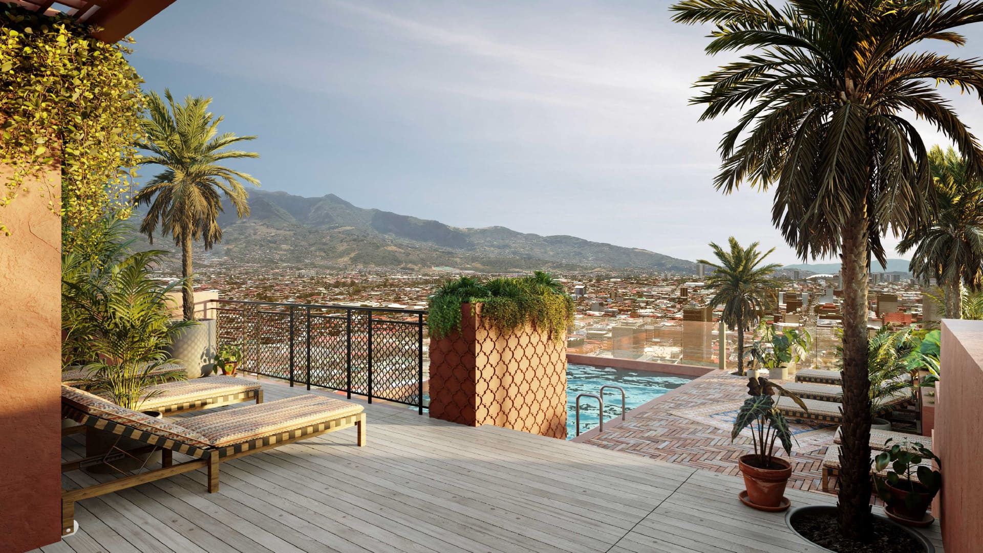 🏊 Piscina (Piso 33): disfrute atardeceres únicos con ambientación marroquí.