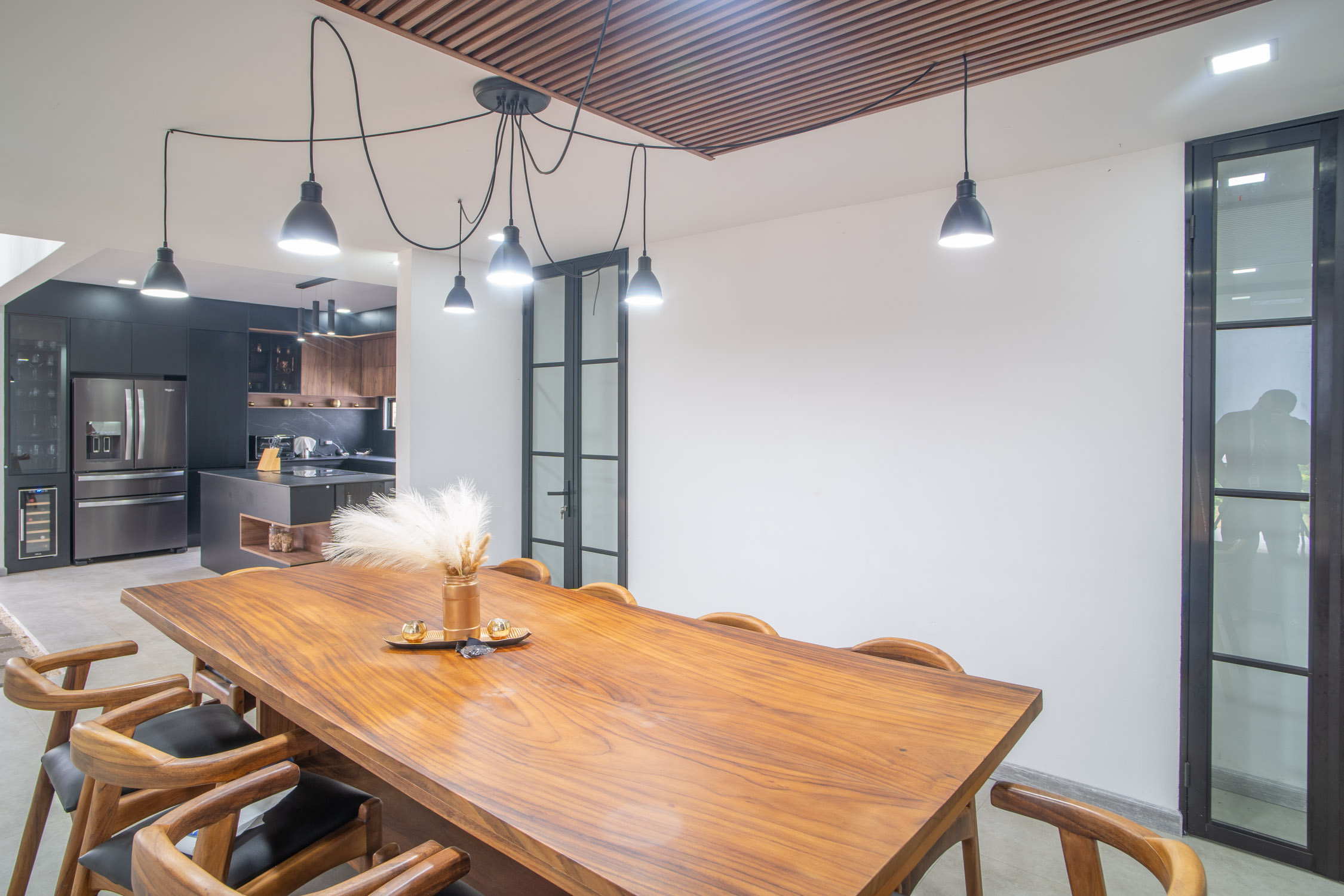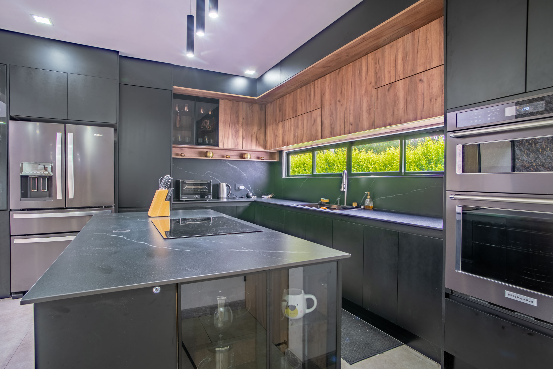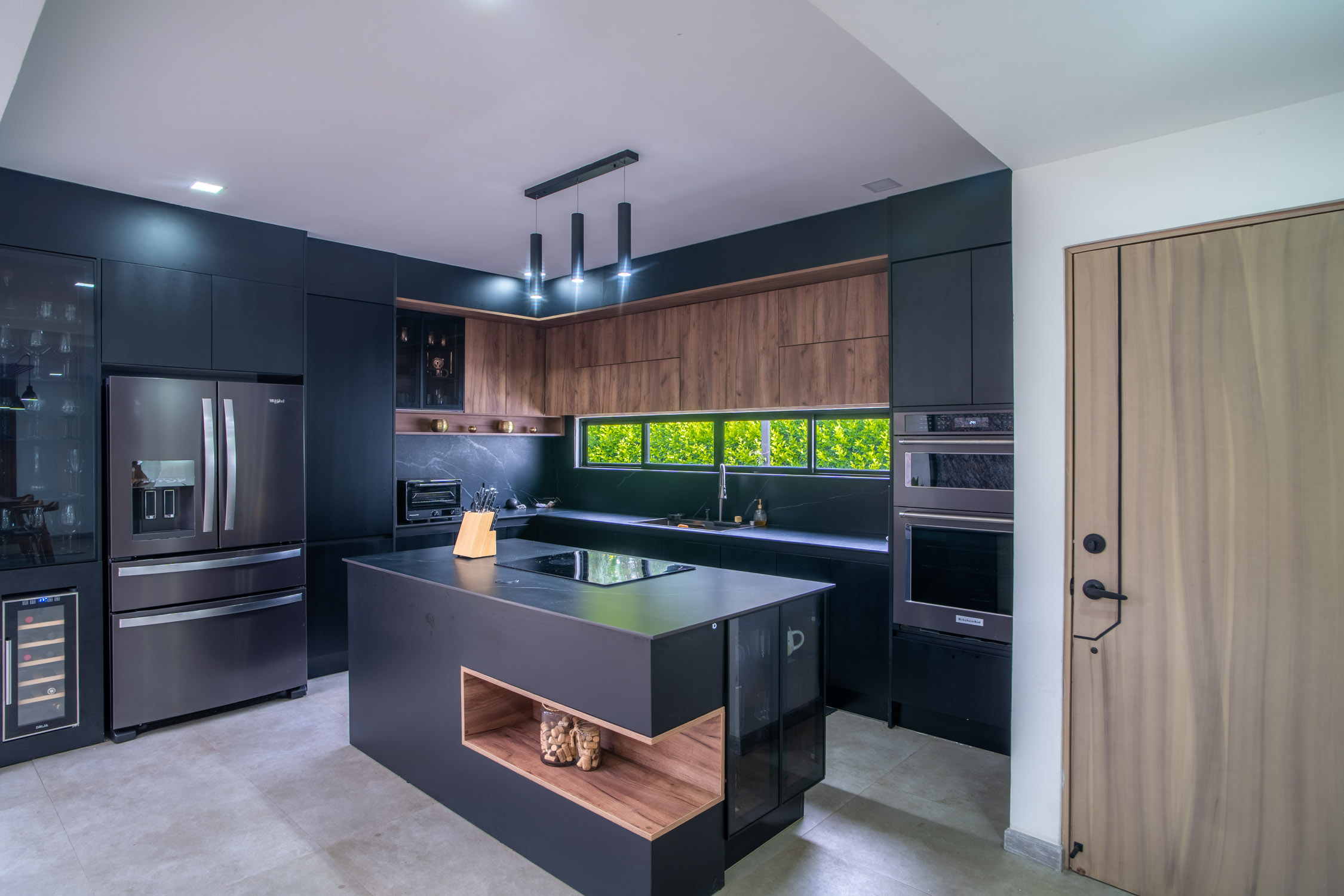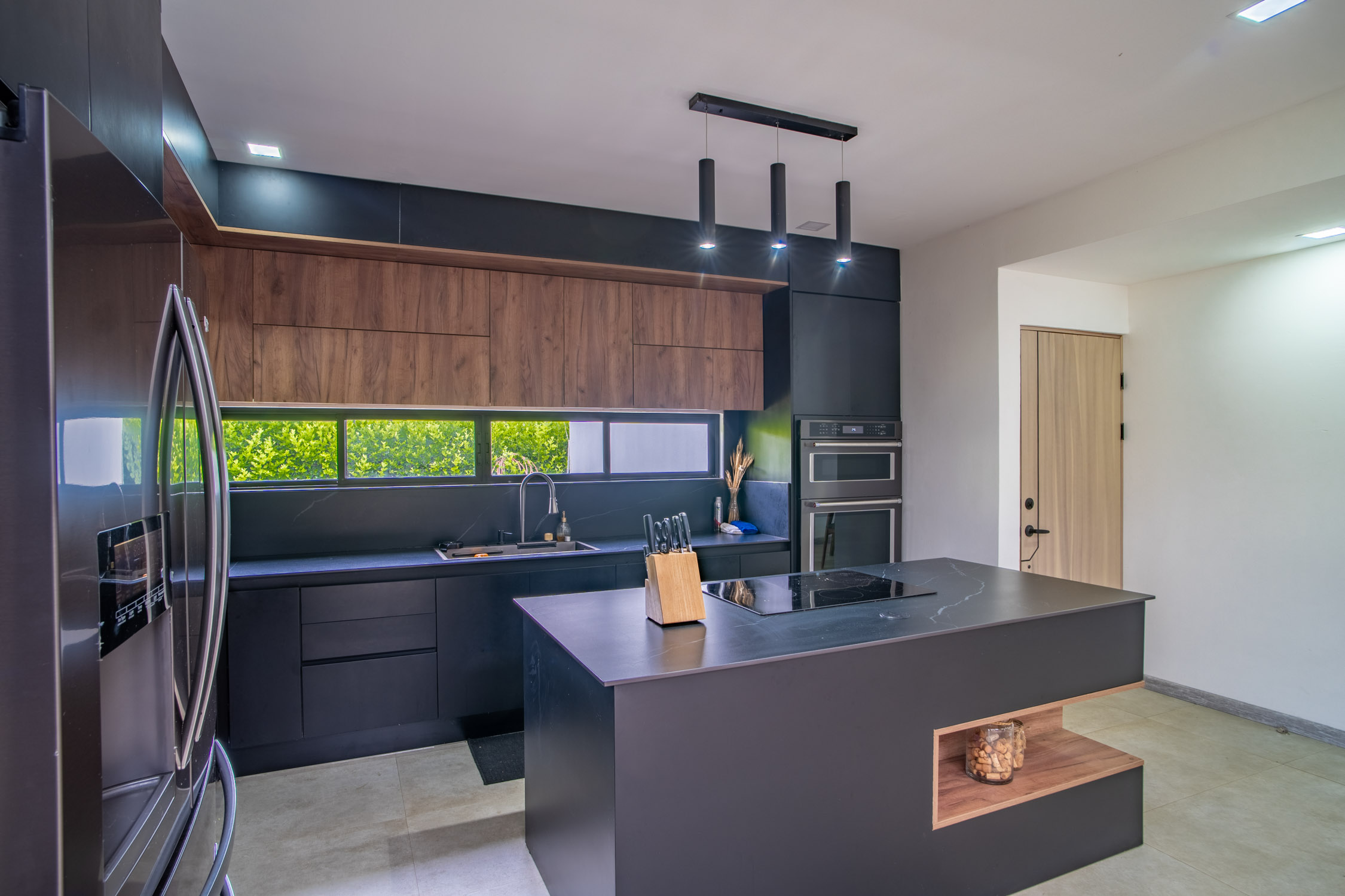 - Cocina moderna color negro con isla de porcelanato, perfecta para compartir momentos especiales.