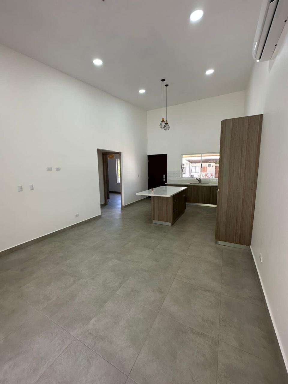 La cocina cuenta con isla de cuarzo, muebles modernos y se entrega con aires acondicionados y abanicos de techo en cada espacio 🌬️.