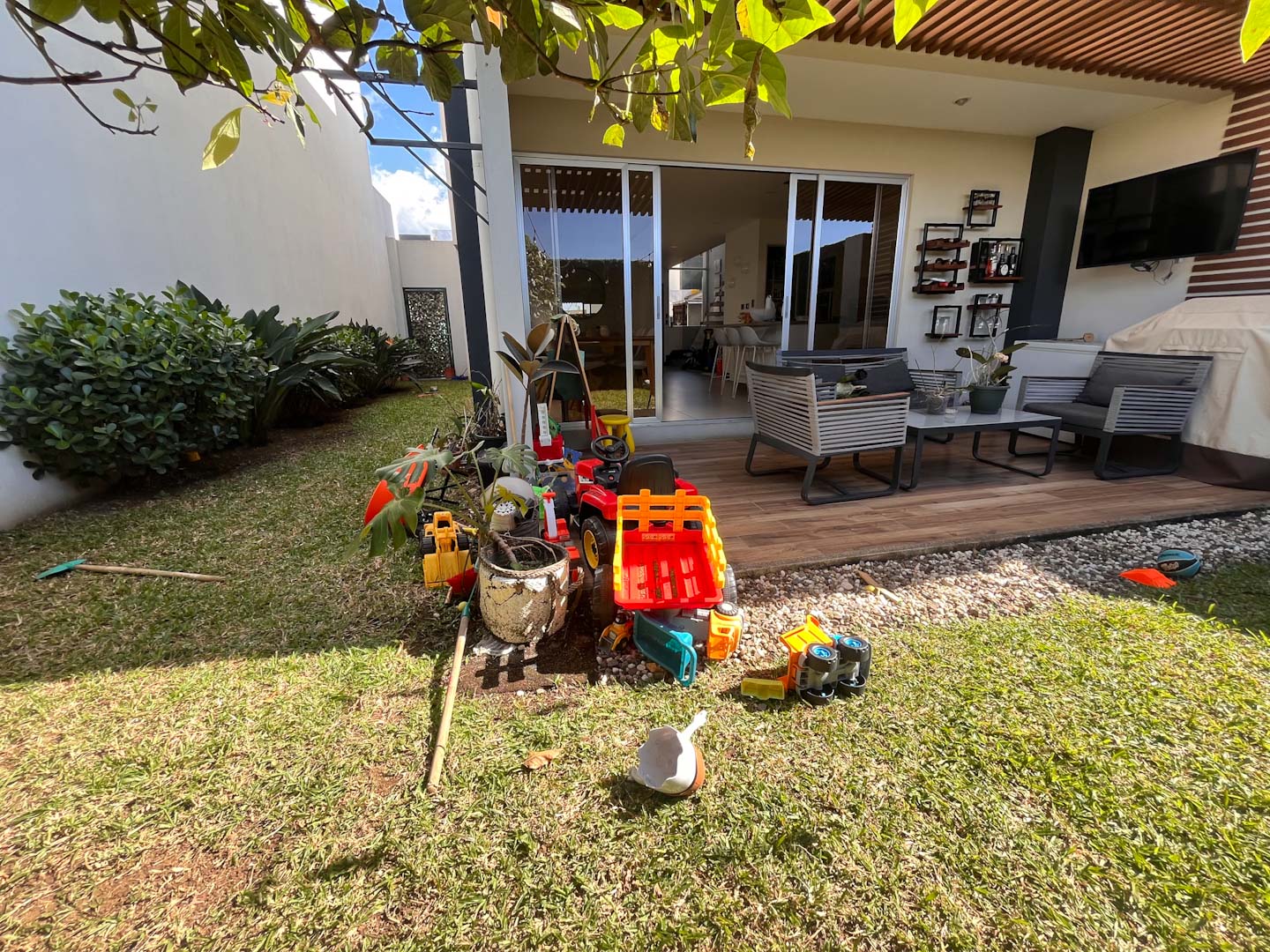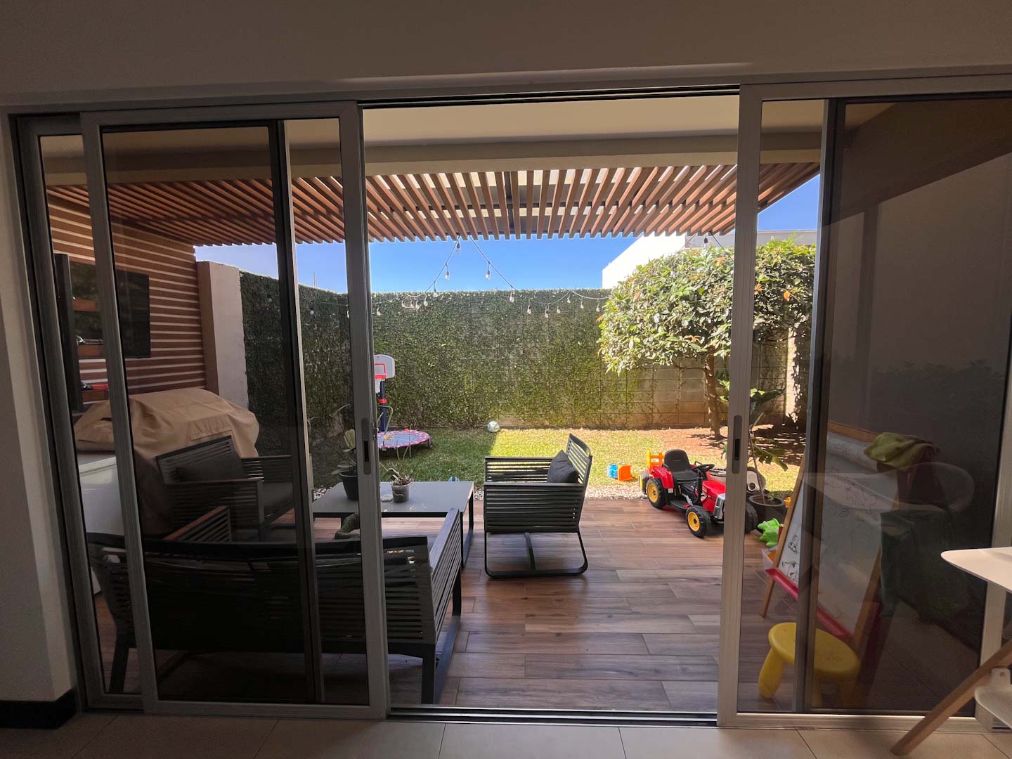 Terraza techada y patio en forma de L
