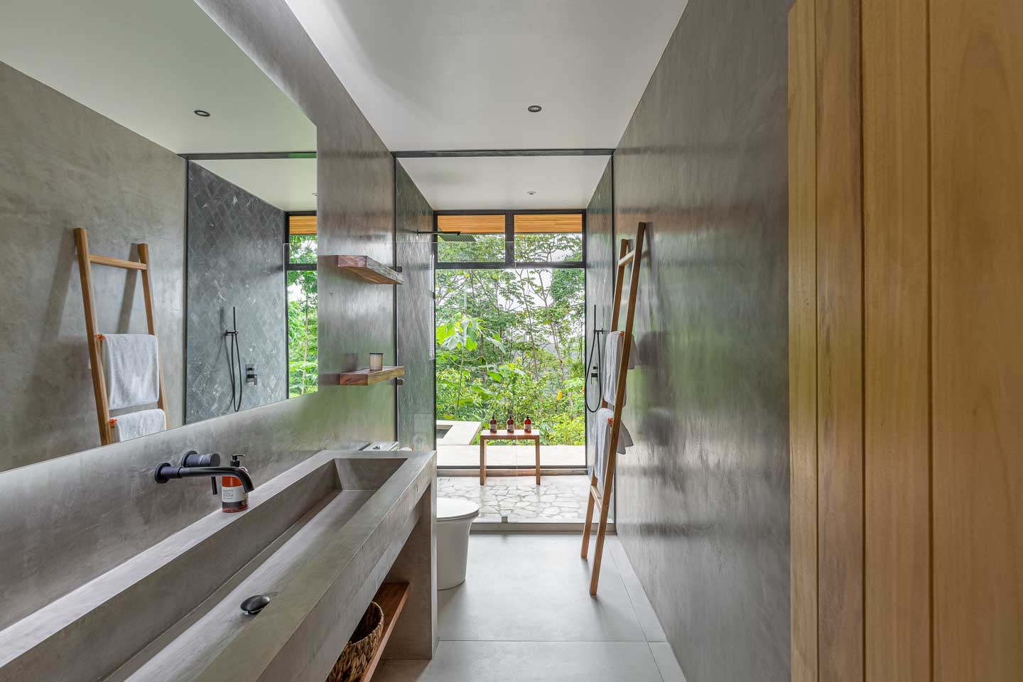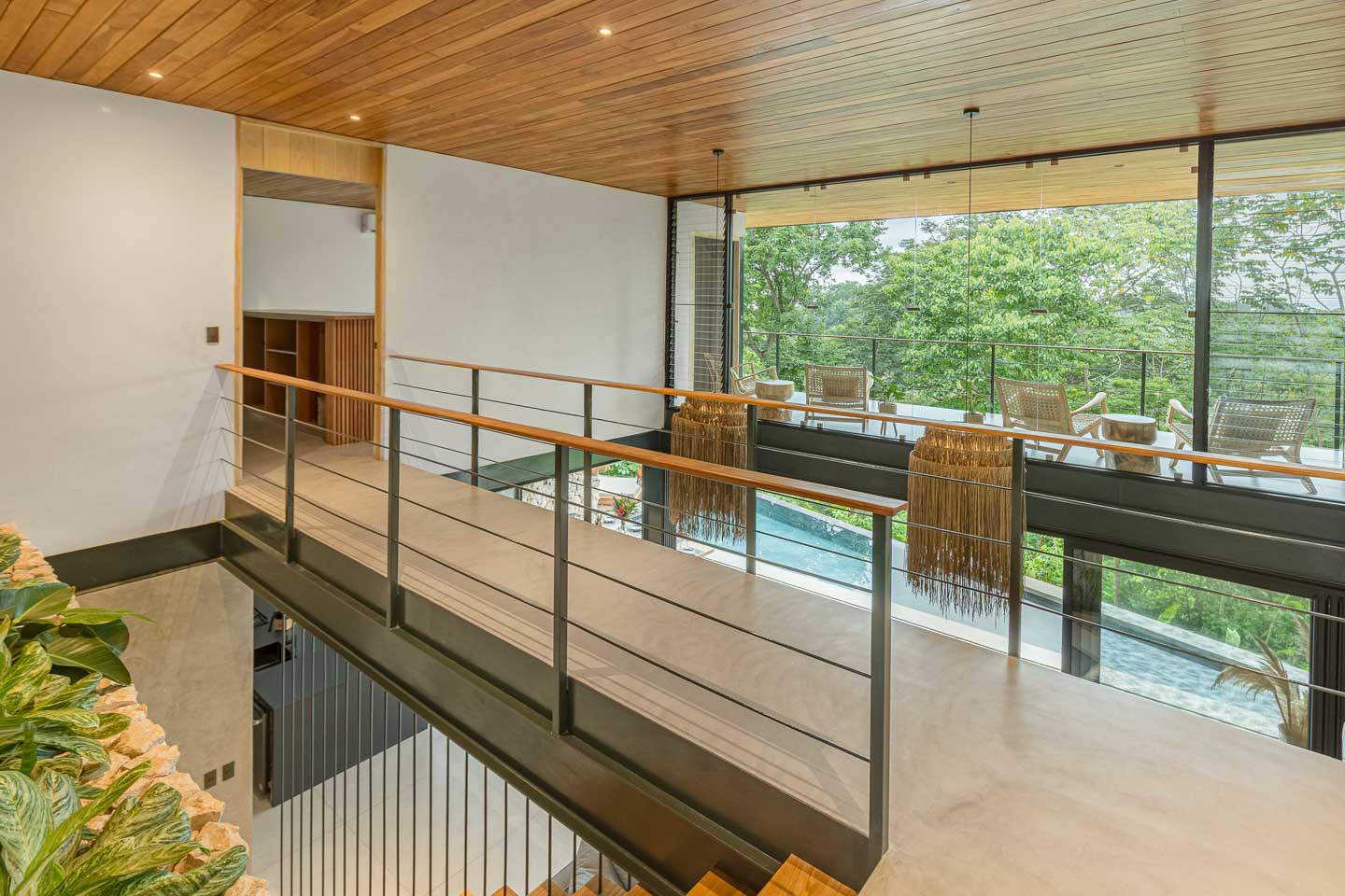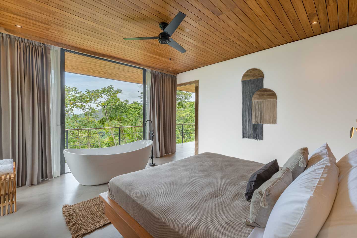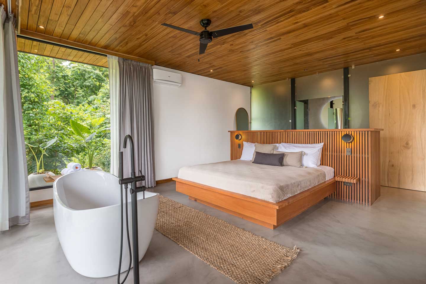 - Dormitorio principal en el nivel inferior con vistas a la piscina y al dosel de la jungla.