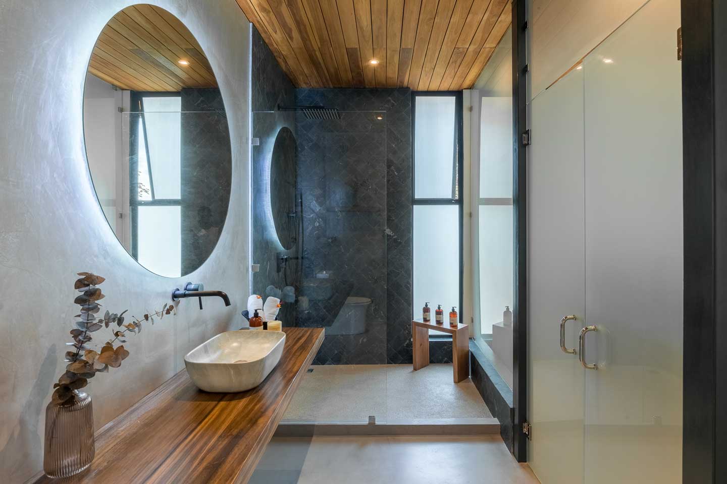 - Natural materials like polished concrete and stone harmonize with the surroundings.