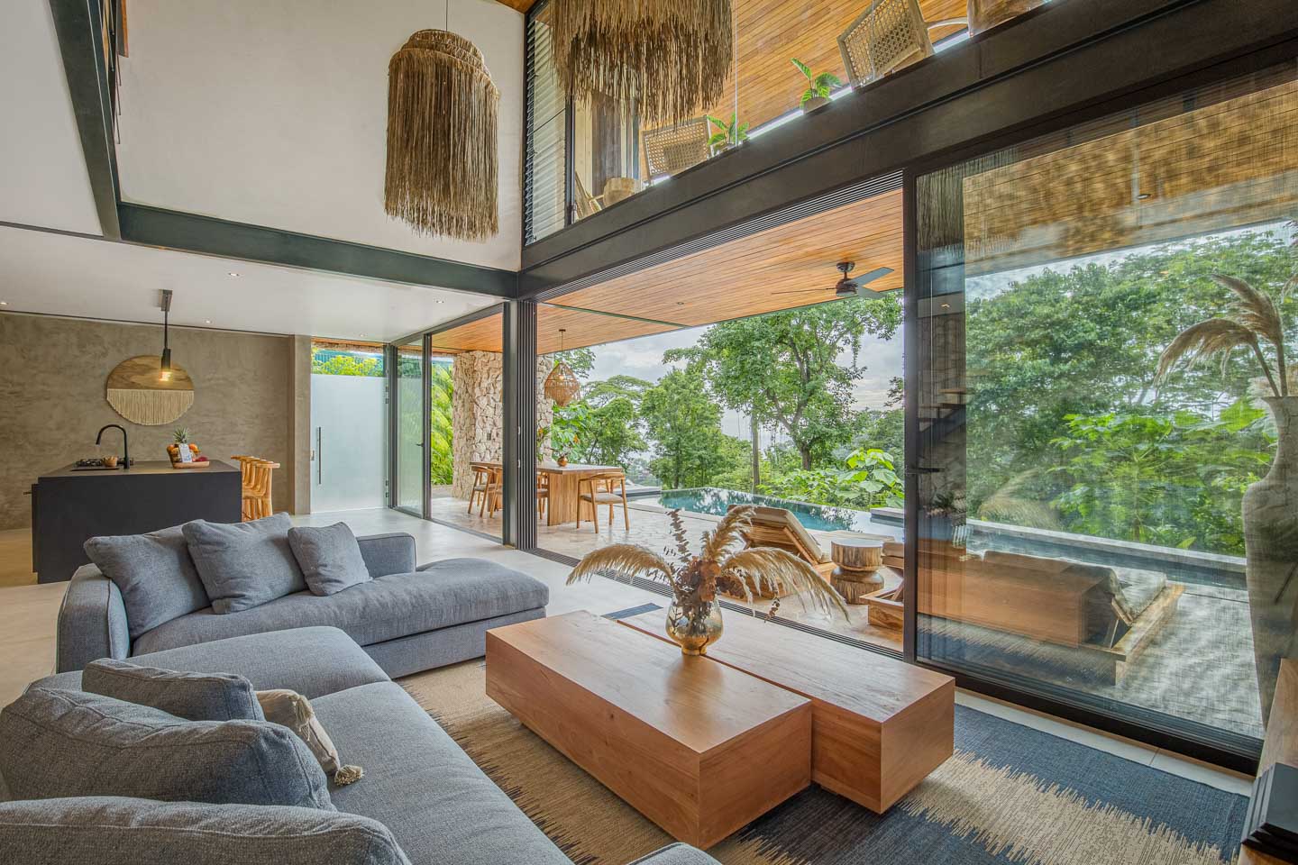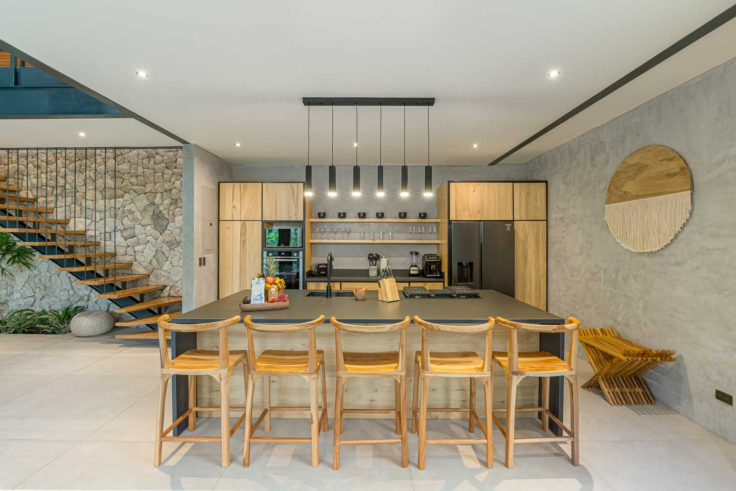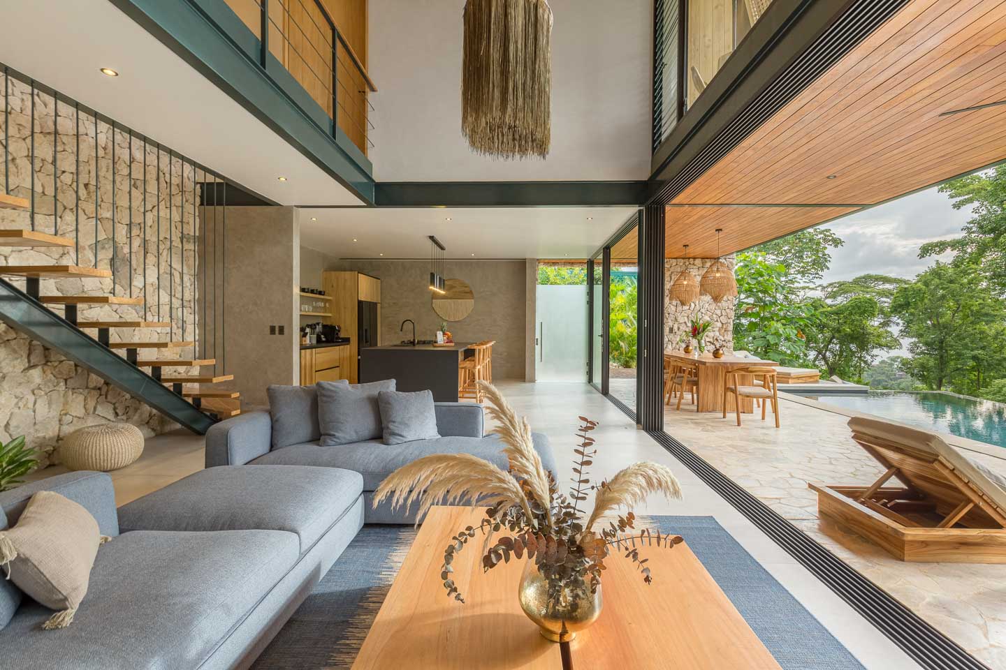 - Materiales naturales como concreto pulido y piedra, con integración perfecta entre espacios interiores y exteriores.