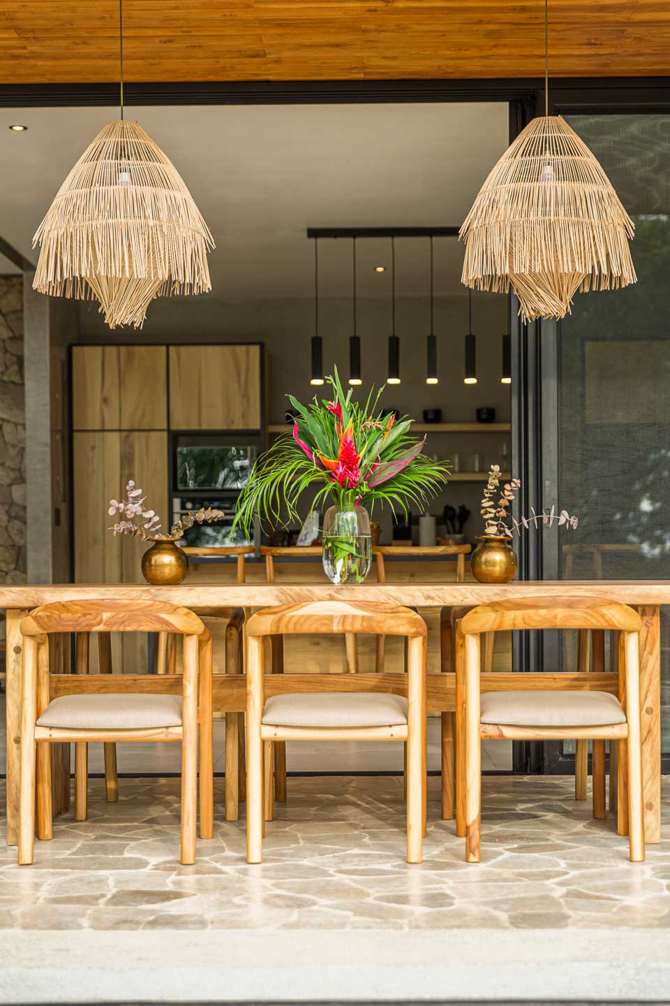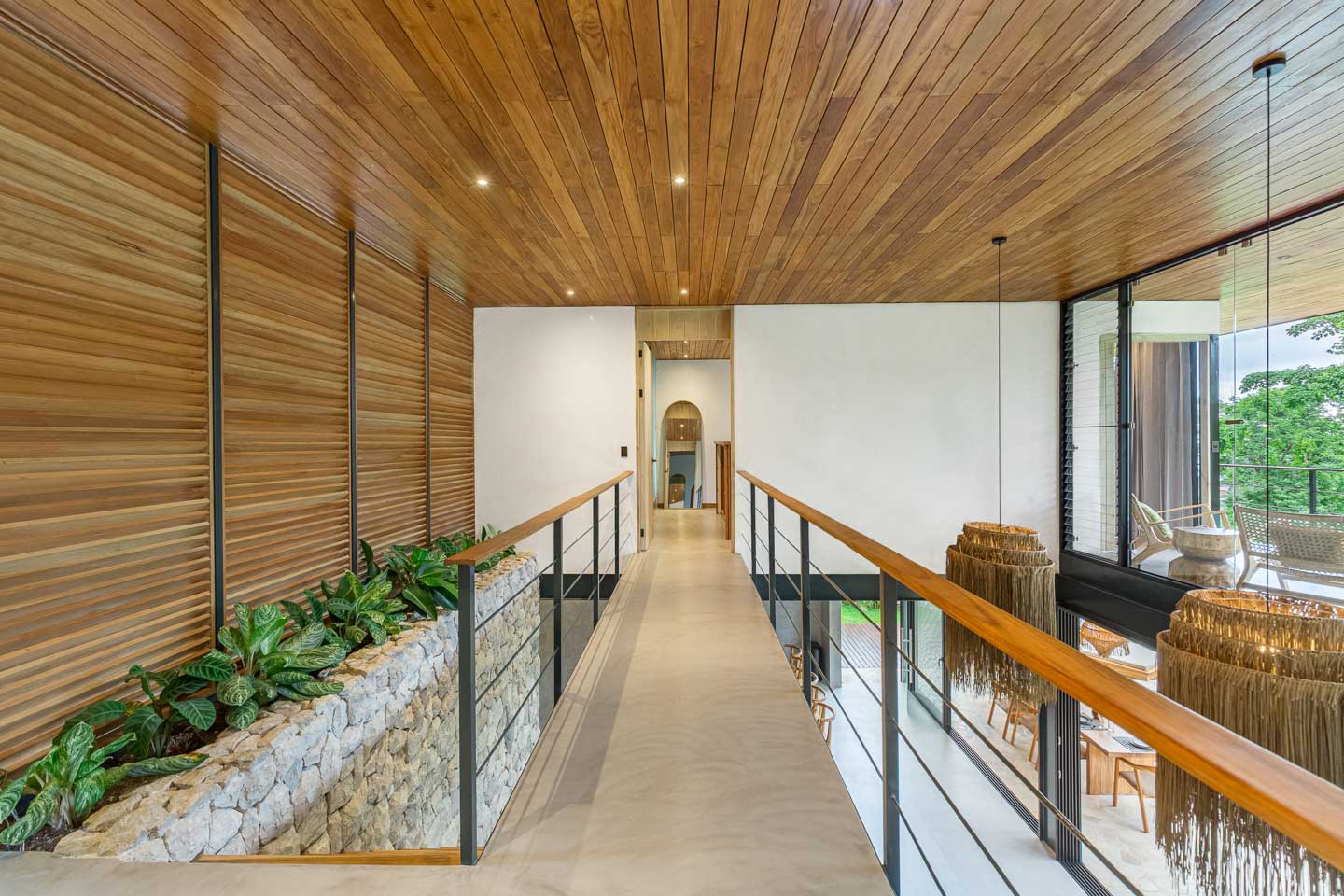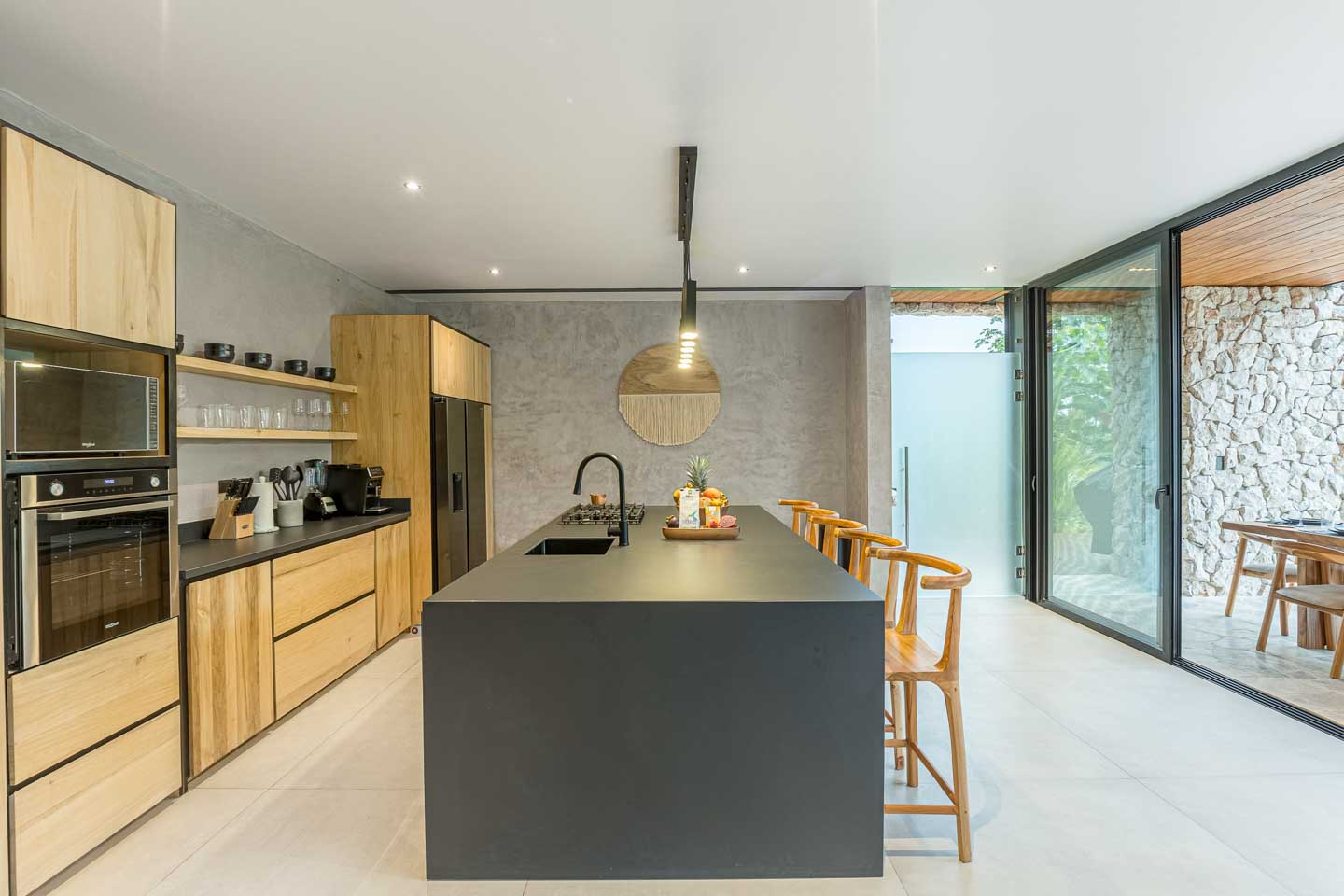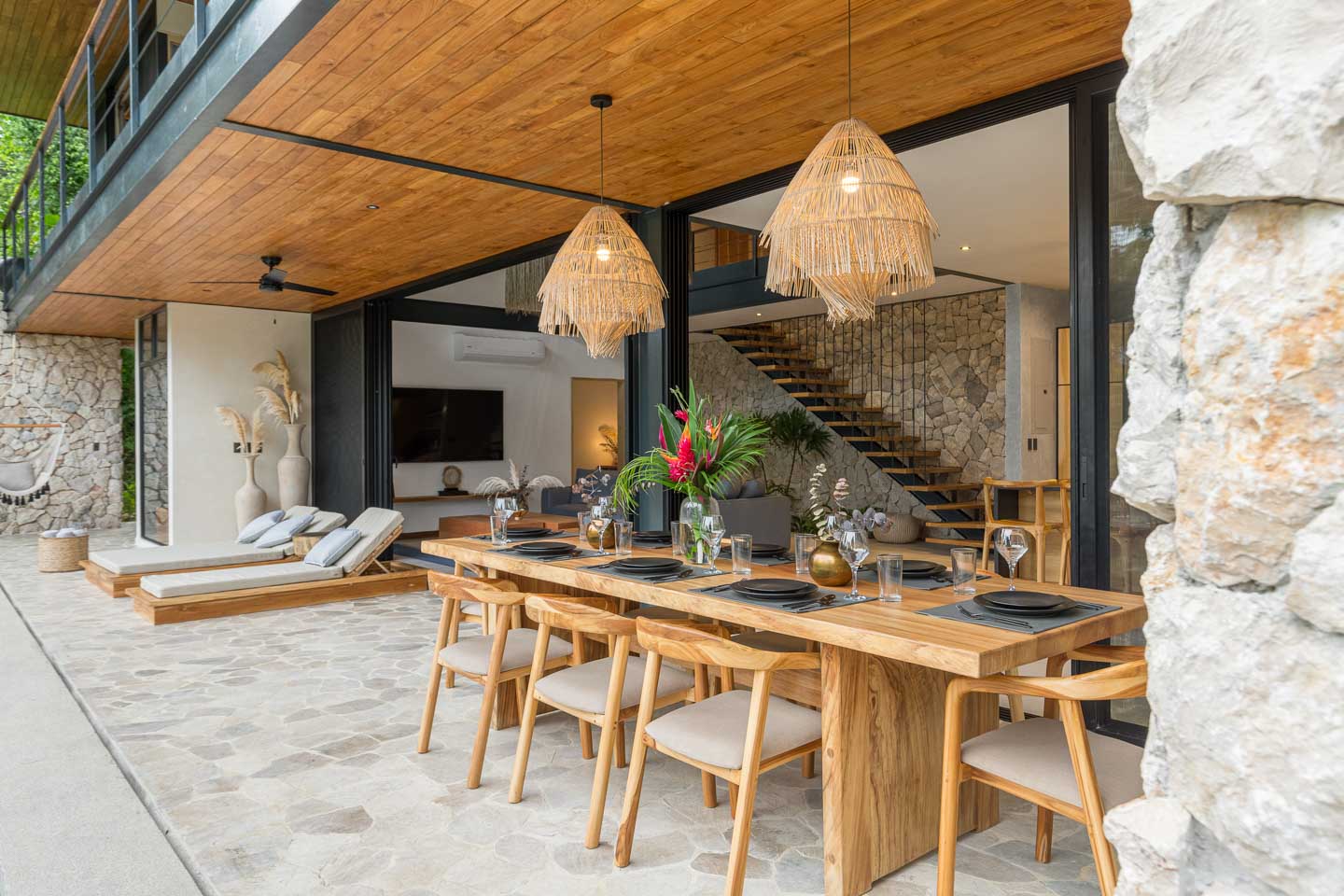 - Materiales naturales como concreto pulido y piedra, con integración perfecta entre espacios interiores y exteriores.