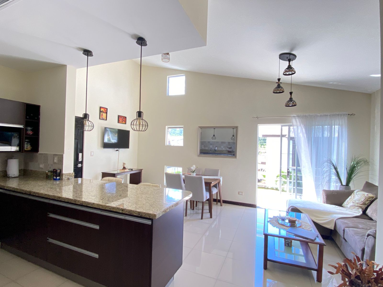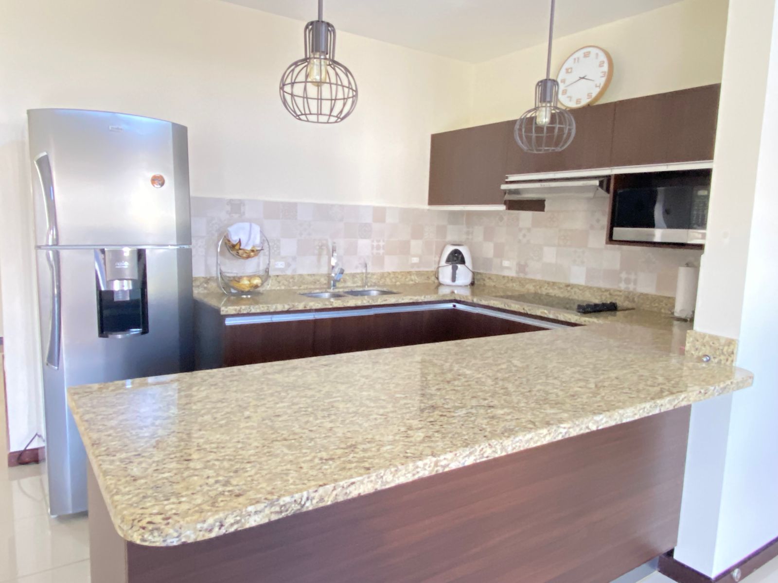 - Cocina con desayunador semi equipada con plantilla, microondas, extractor, sobre de granito y muebles en melamina hidrófuga