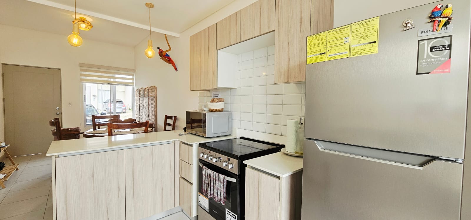 - Línea blanca completa: refrigeradora, cocina, horno de microondas, horno tostador, licuadora, cafetera, menaje, sartenes, entre otras cosas.