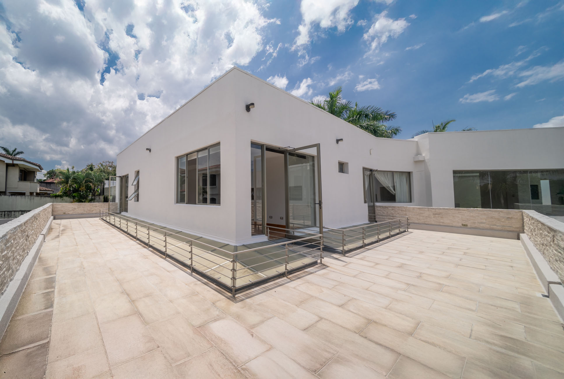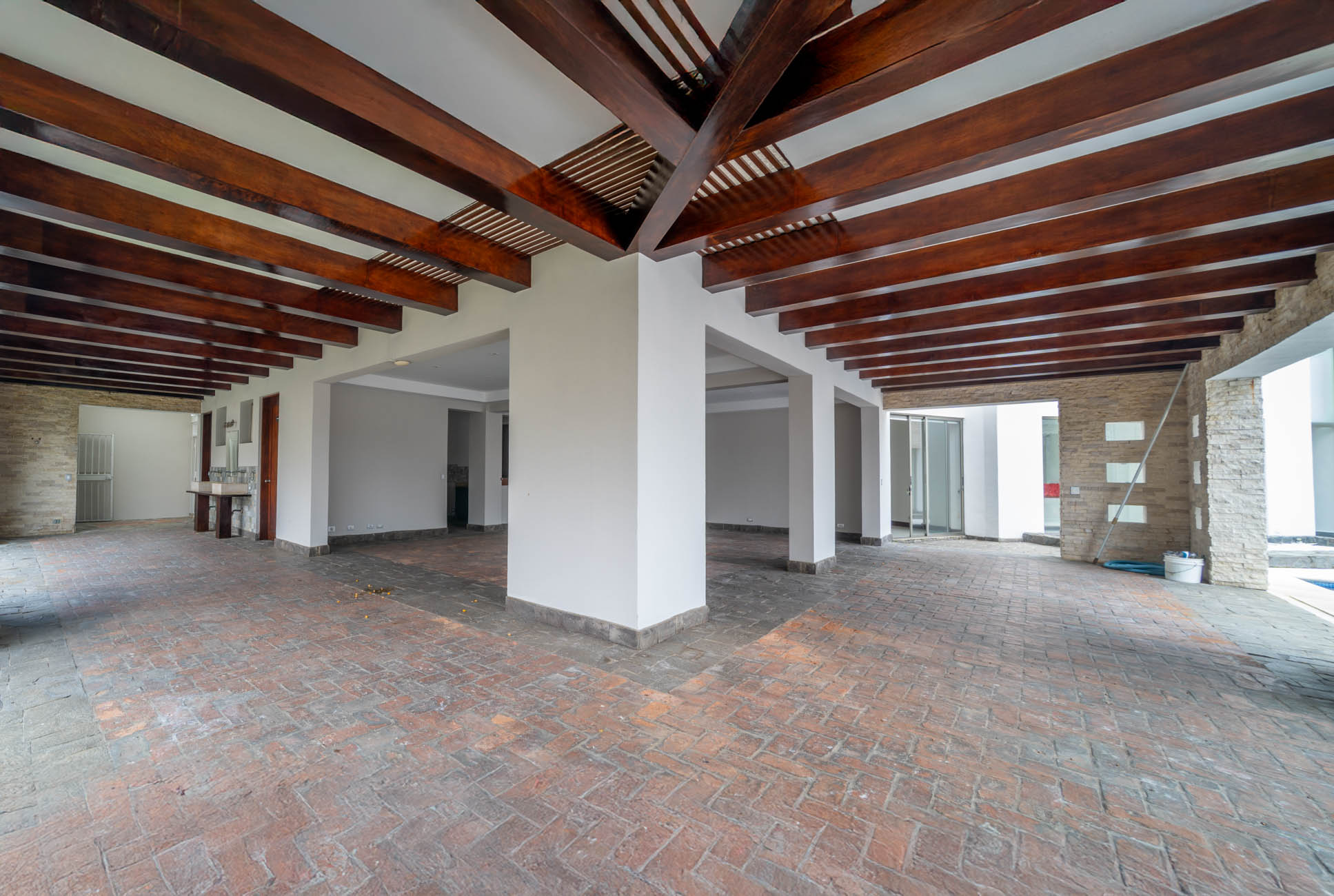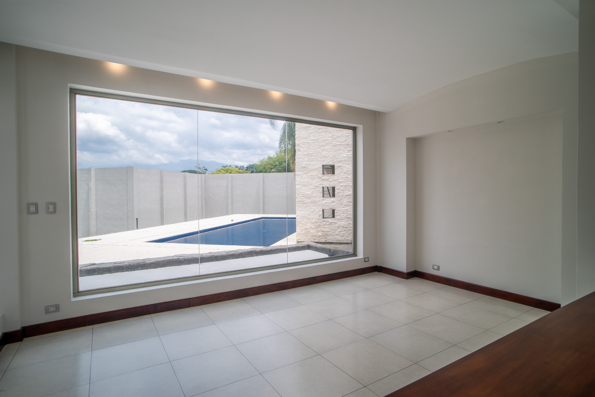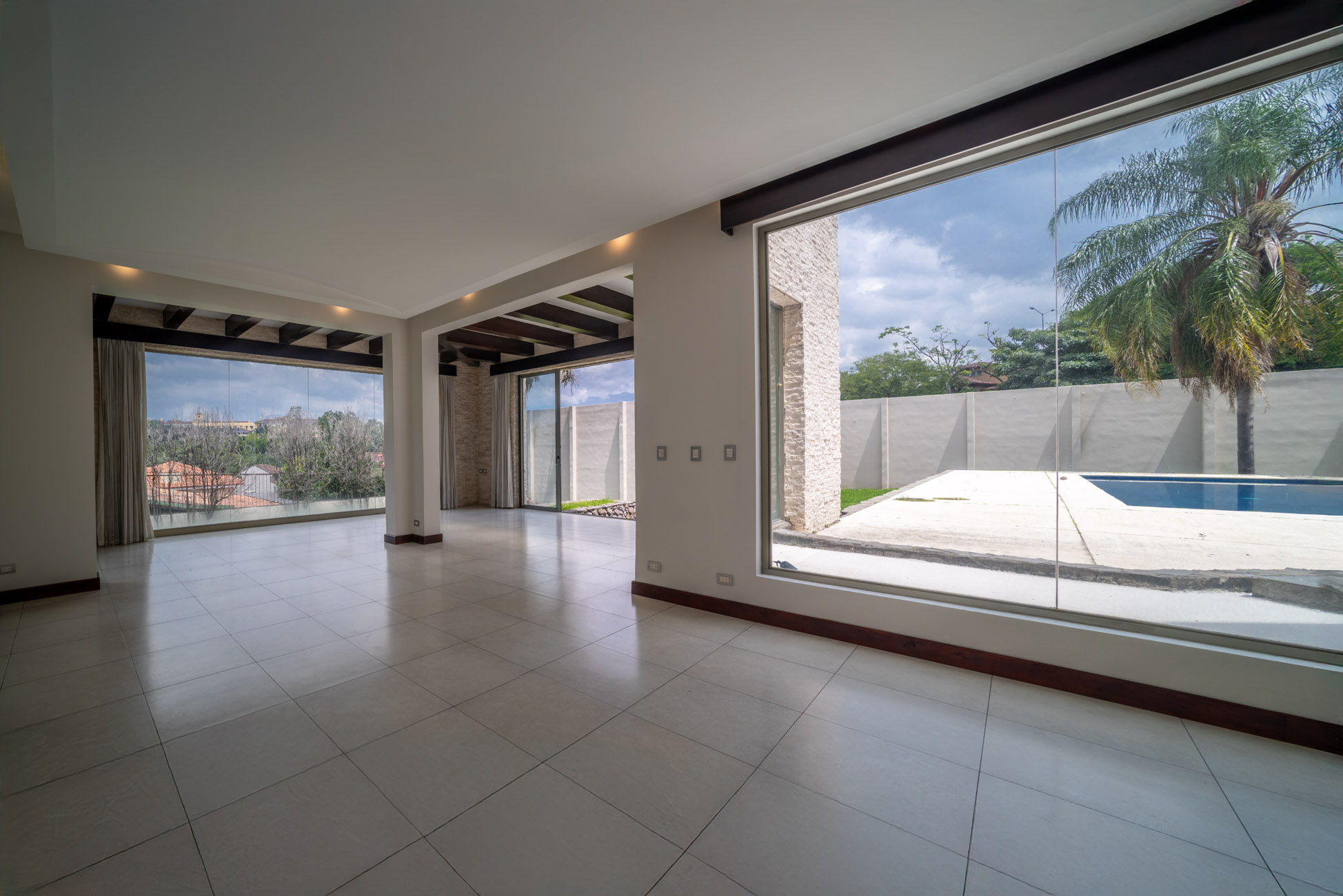 Parqueo enorme, cuarto lavado, cocina, dos alacenas grande, cuarto servicio, terraza para fiestas muy amplia con piscina, dos baños completos en terraza , cuarto servicio con baño completo , jardín enorme, dos aposentos grandes para sala u oficina + otra sala enorme.