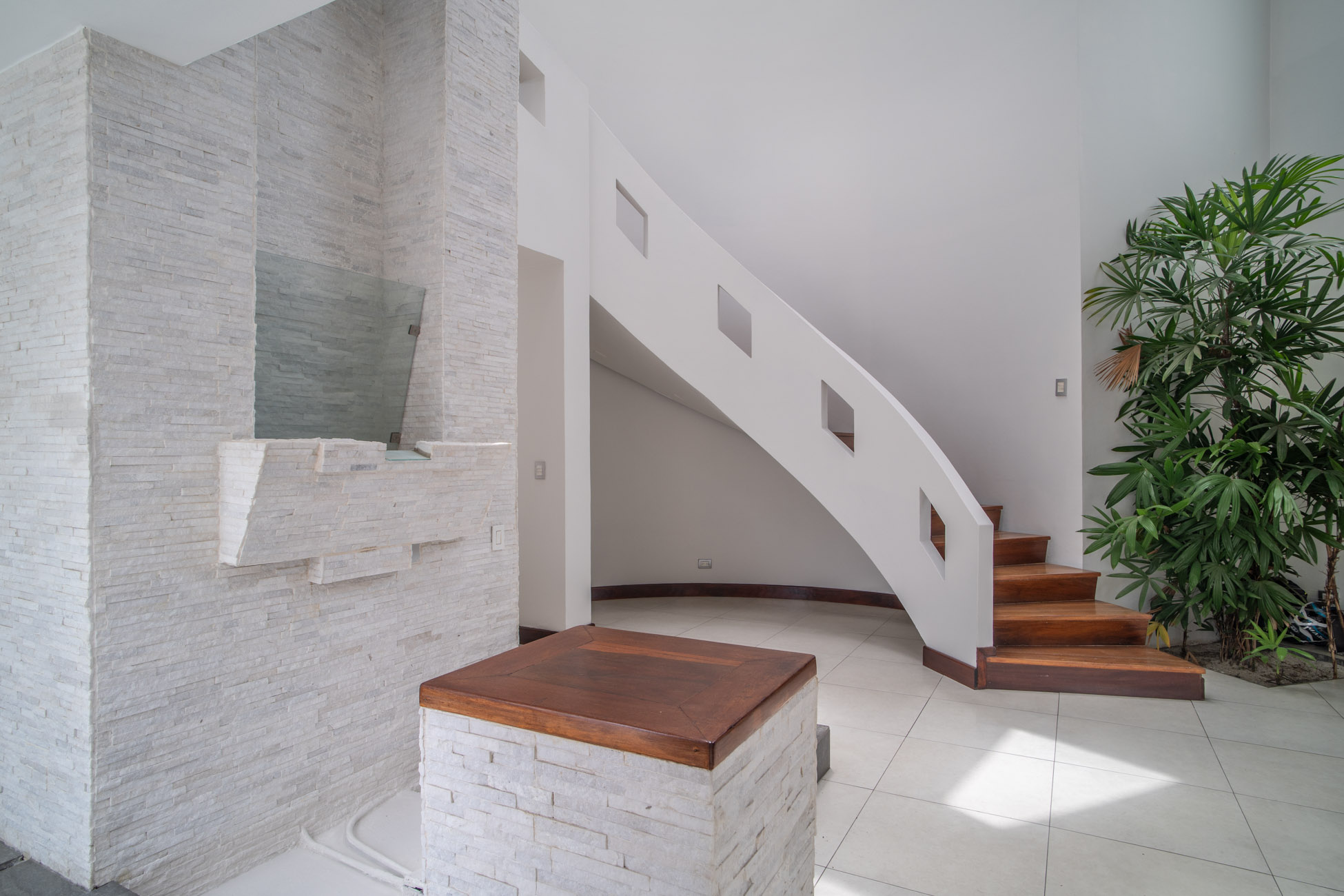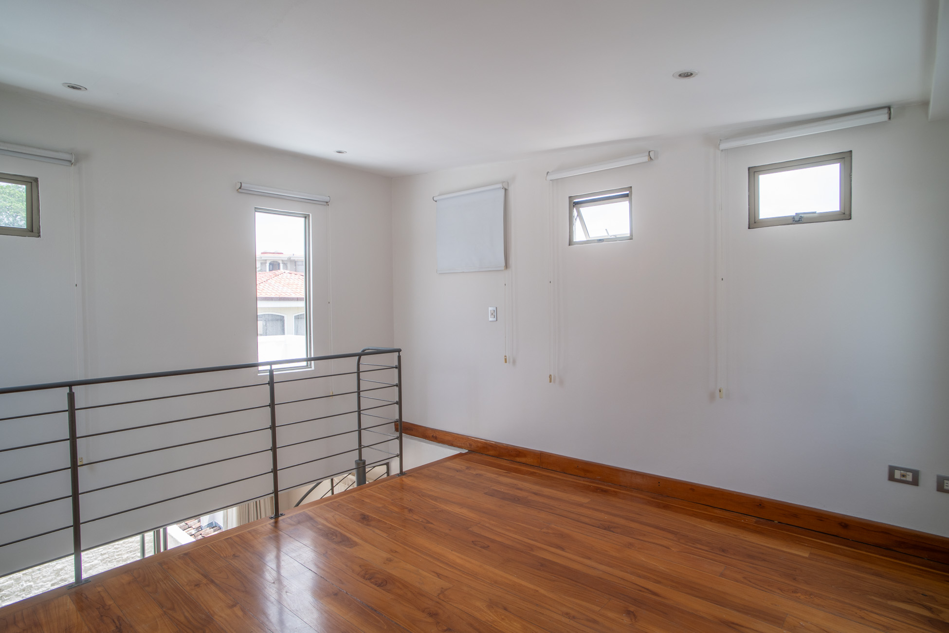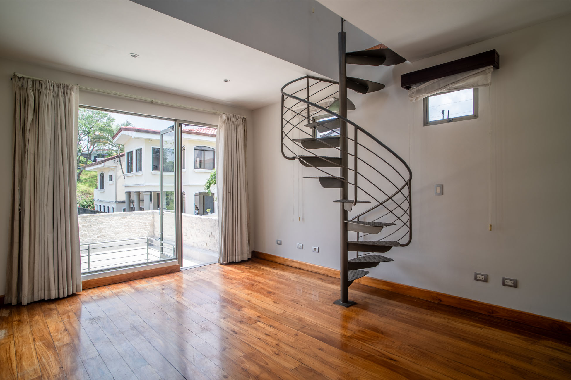 Una de esas habitaciones tiene unas gradas en espiral que llevan a un mezanine en tercer piso