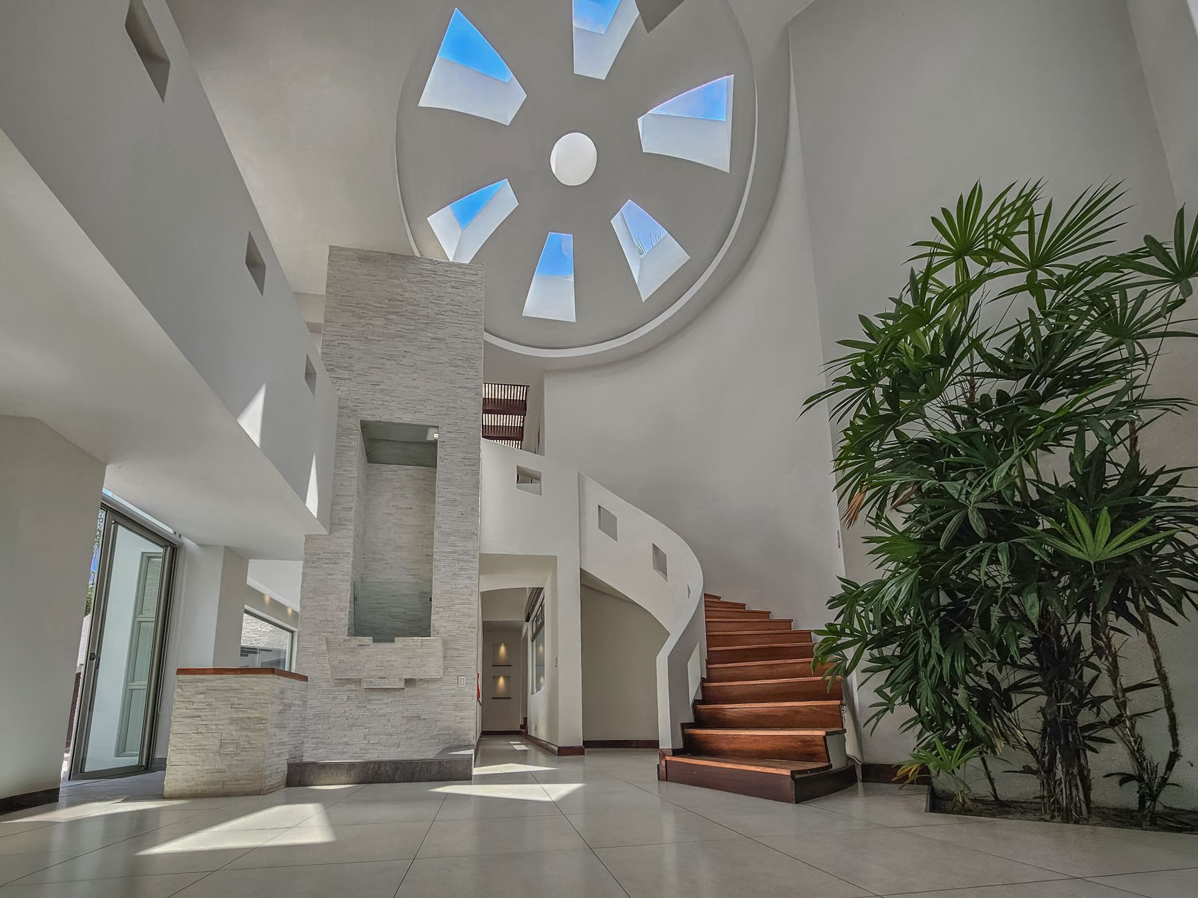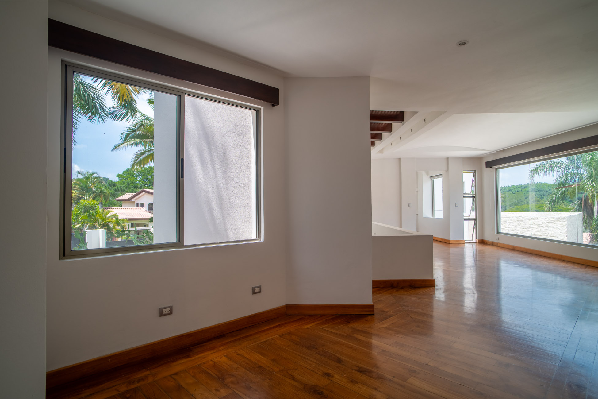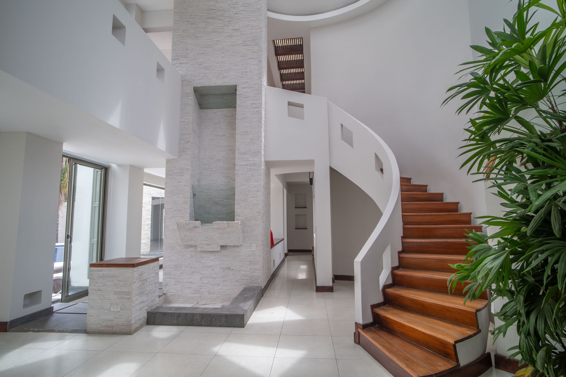 Una de esas habitaciones tiene unas gradas en espiral que llevan a un mezanine en tercer piso